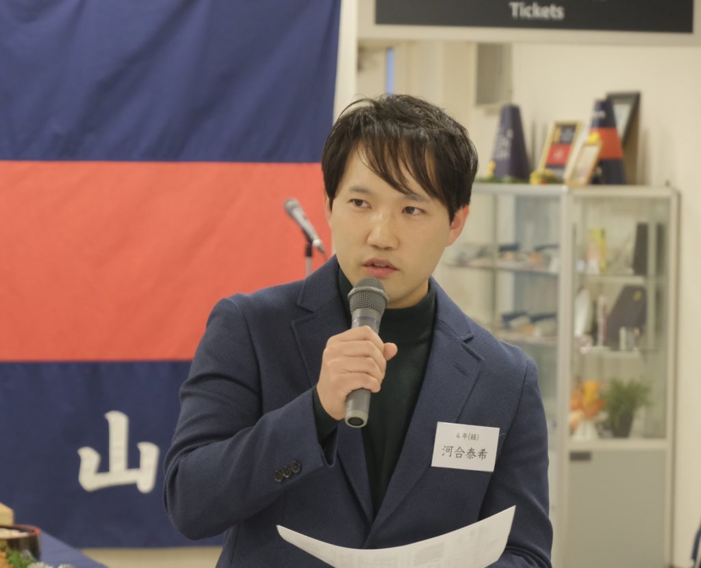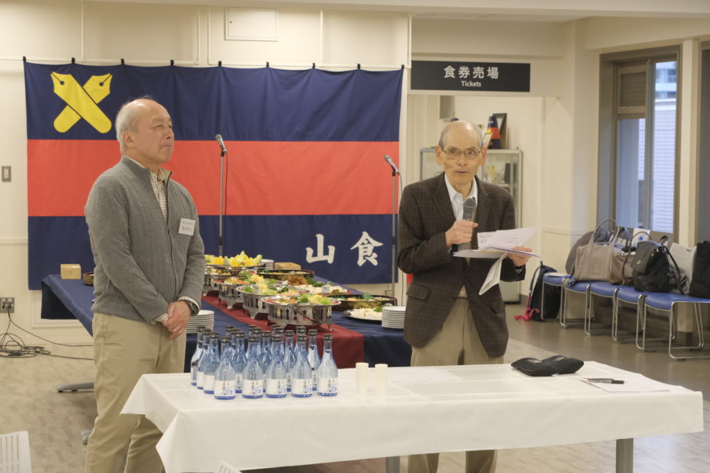16時から山食にて懇親会を行いました。小山廣重さん(S41卒)にご挨拶を頂き、新規会員の島崎さんのご紹介、牧野さんと河合さんによる現役生活動報告、軽部代表への支援金贈呈、半田会長の乾杯に続き懇親会がスタートしました。今回は少し趣向を変えて、各テーブルに分かれて現役生が各々の実際の活動の状況報告を行い。それをOB含めてみんなでワイワイやる懇談になりました。15名の現役生に出席してもらったので、これまで以上に現役・OBの絆が深まったとの感想を頂いています。飯塚副会長の閉会の挨拶に続き、今回新任の河内監事による「若き血」をみんなで合唱して懇親会がお開きになりました。